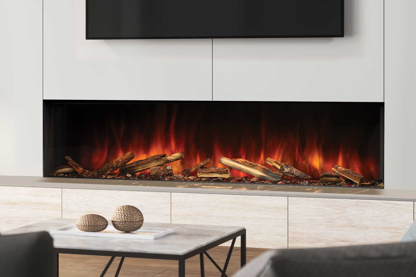 68 1/4 po (largeur) x 23 3/4 po (hauteur) x 6 po (profondeur) - Foyer électrique très grand format avec profil mince, idéal pour un look contemporain et épuré